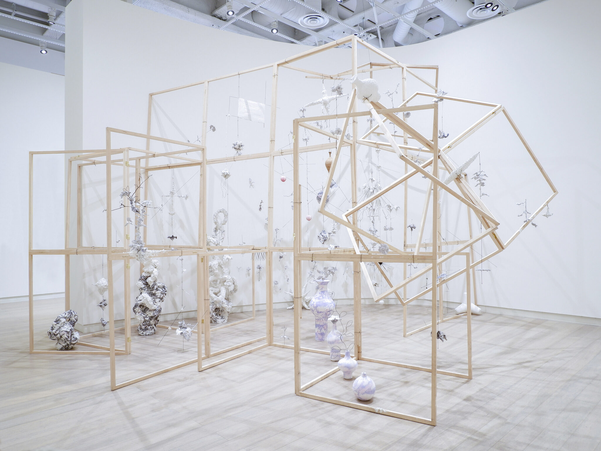 If the process to object is a story of becoming, then I drift along the tangents of its making. It is to make insulation foam into water, then flesh of fruit, back to substrate and on. To make borders into branches, once closed systems porous, overlapping— to create abundance with less, expanding possibilities, as non-linear, as pluralities, and even contradictions. Collapsible architecture is re/arranged with tangential objects to propose a constellation amid uncertainty. They are ecosystems unrooted. Still lives in transition, displaced, and arranged again seeking stillness. While their histories become lost in translation, in its place new stories emerge.