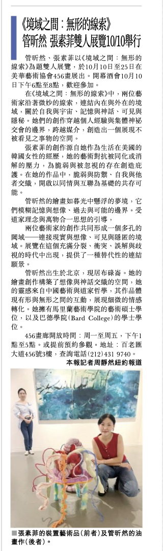 2025.10.9[Sing Tao Daily/星島日報]《境域之間:無形的線索》管昕然 張素菲雙人展覽10/10舉行 ....more