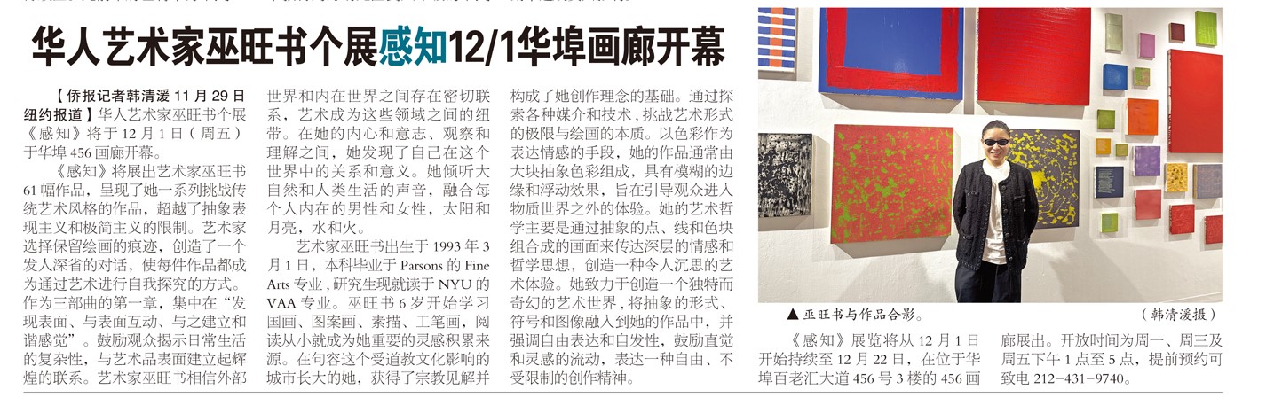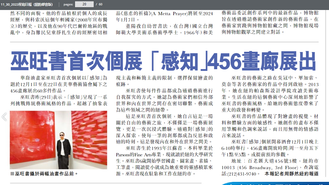 2023.12.5[US China/僑報] 華人藝術家巫旺書個展感知12/1華埠畫廊開幕 ....點選更多訊息