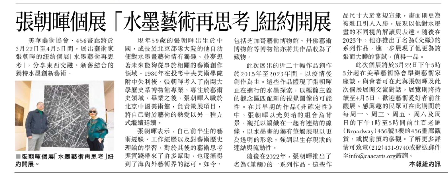 2024.3.26 | [Sing Tao Daily/星島日報] 張朝暉個展「水墨藝術再思考」紐約開展 ....點選更多訊息 |